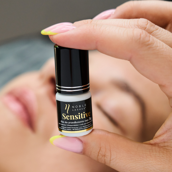 Lepidlo na prodlužování řas Sensitive od Noble Lashes je produkt zvláště doporučený pro citlivé oči, u kterých by práce se silným lepidlem mohla vyvolat nežádoucí alergickou reakci. Jemné složení snižuje pravděpodobnost podráždění očí a výskytu alergií. Charakteristickým rysem tohoto lepidla je mimořádně hustá konzistence při relativně rychlé době schnutí. Je ideální pro aplikaci umělých řas na spodní víčko a pro metodu Blink Express.