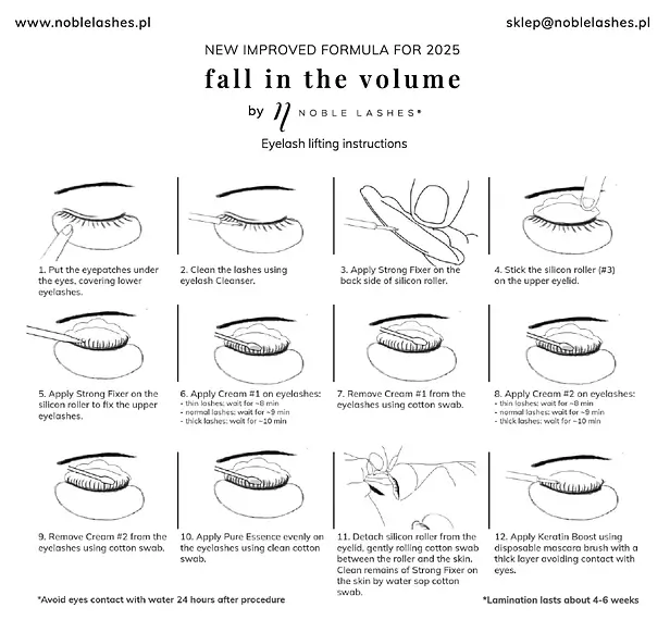 Fall in the Volume je kompletní sada na lash lifting a laminaci řas, která poskytuje krásný efekt natočení a posílení řas při současné ochraně jejich přirozené struktury. Díky jemnému, ale účinnému složení řasy zůstávají zdravé a klientky se rády vracejí na další procedury. Jedná se o bezpečné a výhodné řešení pro stylistky, které chtějí budovat dlouhodobý úspěch svého salonu!
